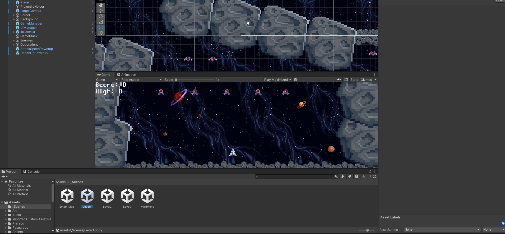 A 2d space shooter game where you have to pick up powerups and defeat enemies to win the levels.